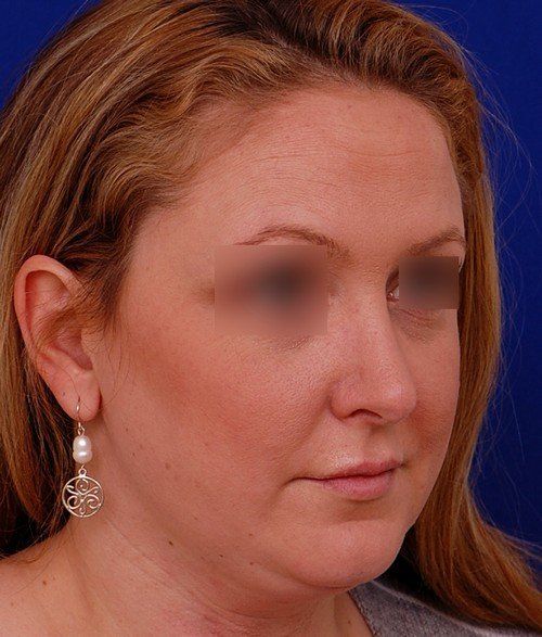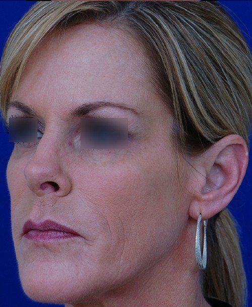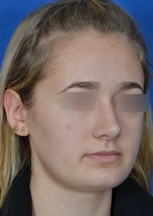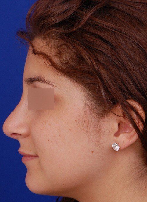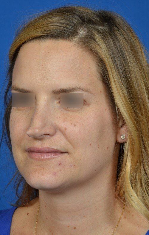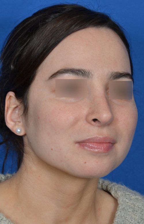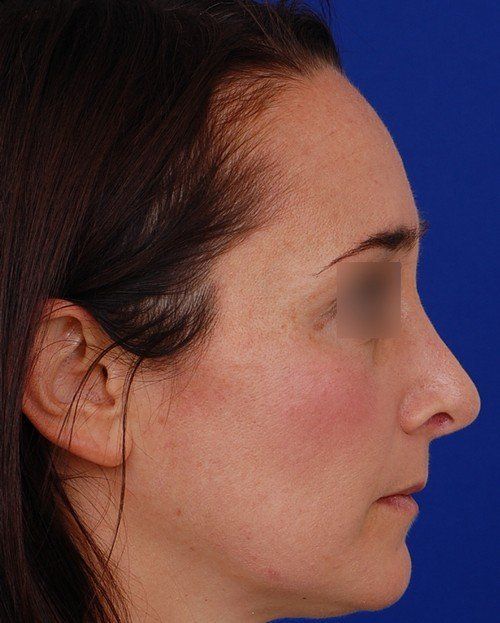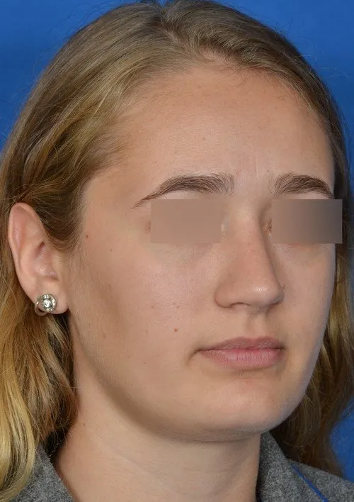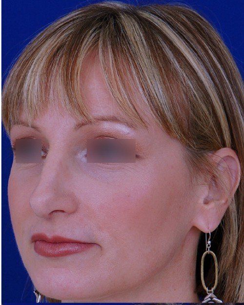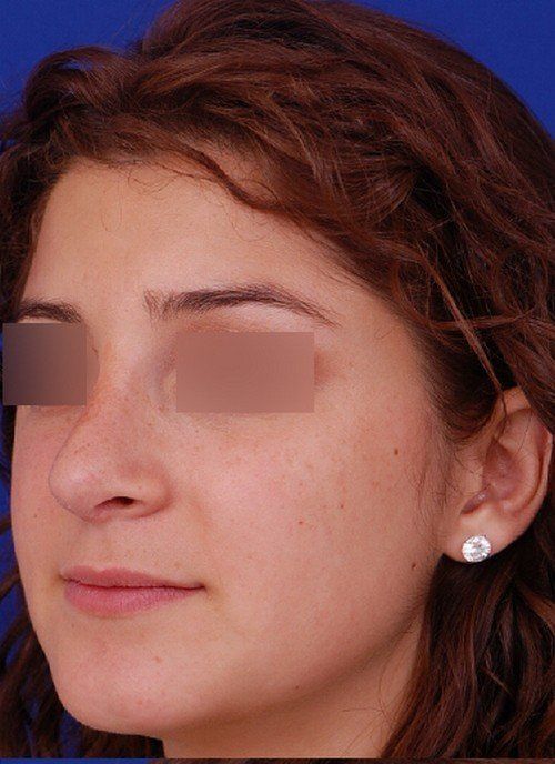 This patient had a saddle nose deformity caused by a septal perforation. A rib cartilage graft was used to straighten her nose and restore the natural contour of her bridge.