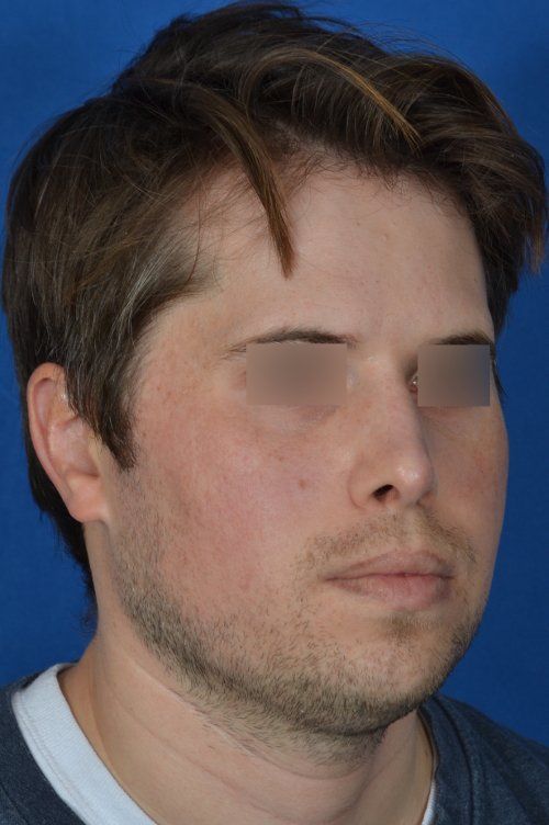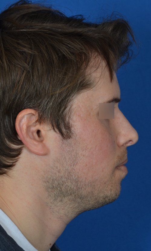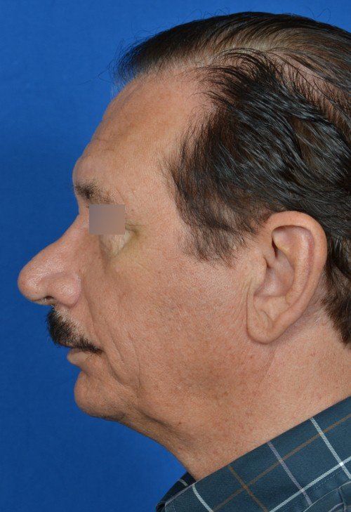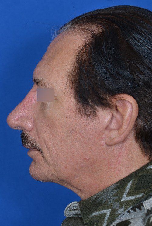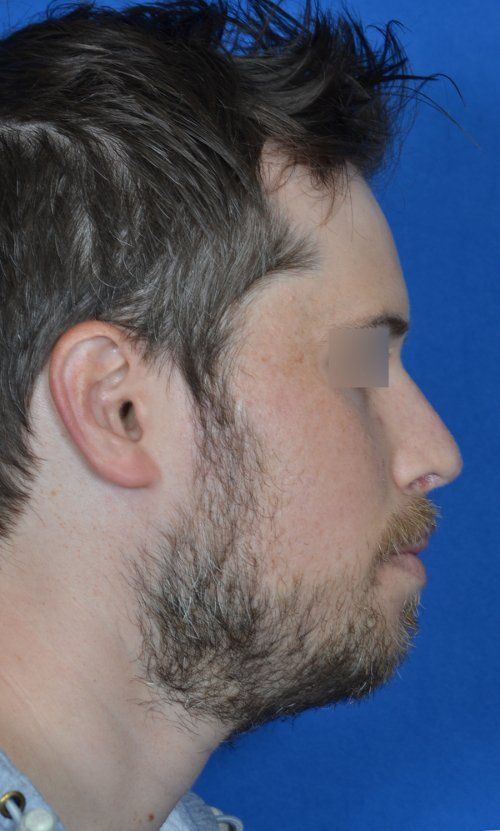 This patient underwent previous rhinoplasty that was overly aggressive. Too much removed from his bridge made his tip look relatively enlarged and took away from masculine features. Augmentation of his bridge gives a more refined and masculine appearance.