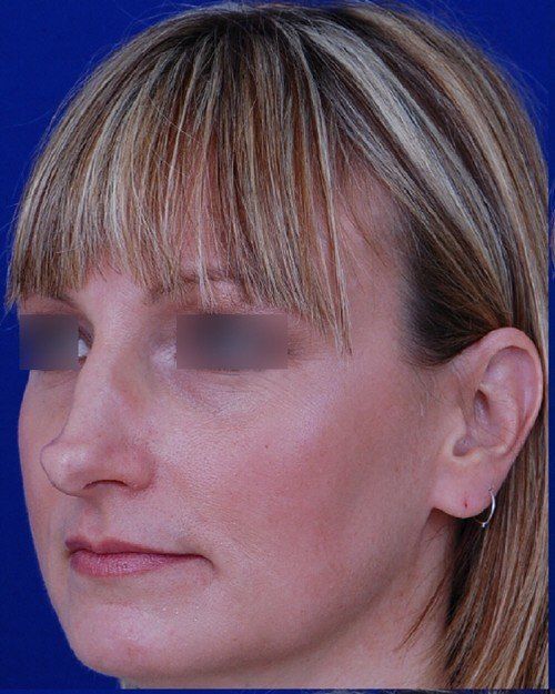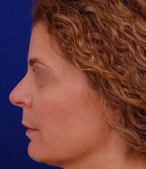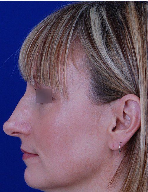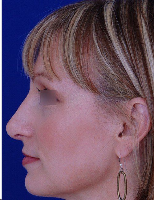 After previous nose surgery elsewhere, this patient was unhappy with the unnatural sharpness at the nasal tip and the amount of nostril show on the side view. Revision tip surgery was performed to round the tip of the nose and lower the nostril rims to make the openings appear smaller.
