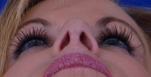 This patient underwent rhinoplasty on two occasions elsewhere and sought a more feminine nose. Revision rhinoplasty was performed to raise the tip of the nose and lower the bridge. Also, the part of the nose between the nostrils, called the columella, was elevated to reduce nostril show.