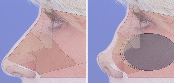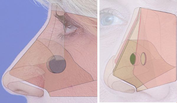 The next step was to rebuild the height of the bridge and tip. We carved a larger piece of rib graft into the desired shape and secured this on top of the bridge, underneath the skin (Fig 2, translucent purple). Also, we secured the tip cartilages to the septal extension graft in a straighter and more projected position. This maintains balance between the newly projected bridge and tip.