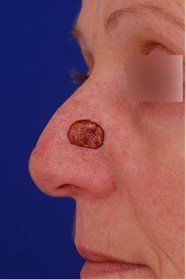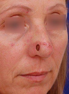 The patient healed well, but two months later she began to have new lesions show up on the right side of her nose. She underwent Mohs surgery again for another basal cell cancer removal and returned to my office after.