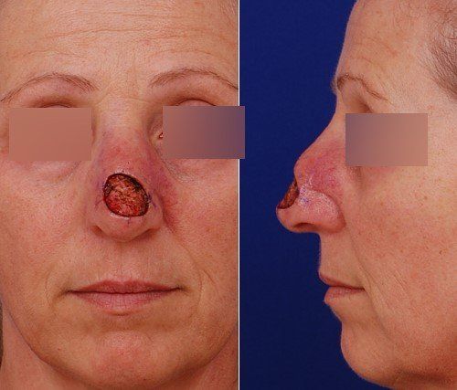 To remove her cancer, she would need to undergo Mohs micrographic surgery, the best technique we currently have to reduce the risk of recurrence. She elected to have a plastic surgeon perform the repair. After the Mohs procedure, she came in to see me: